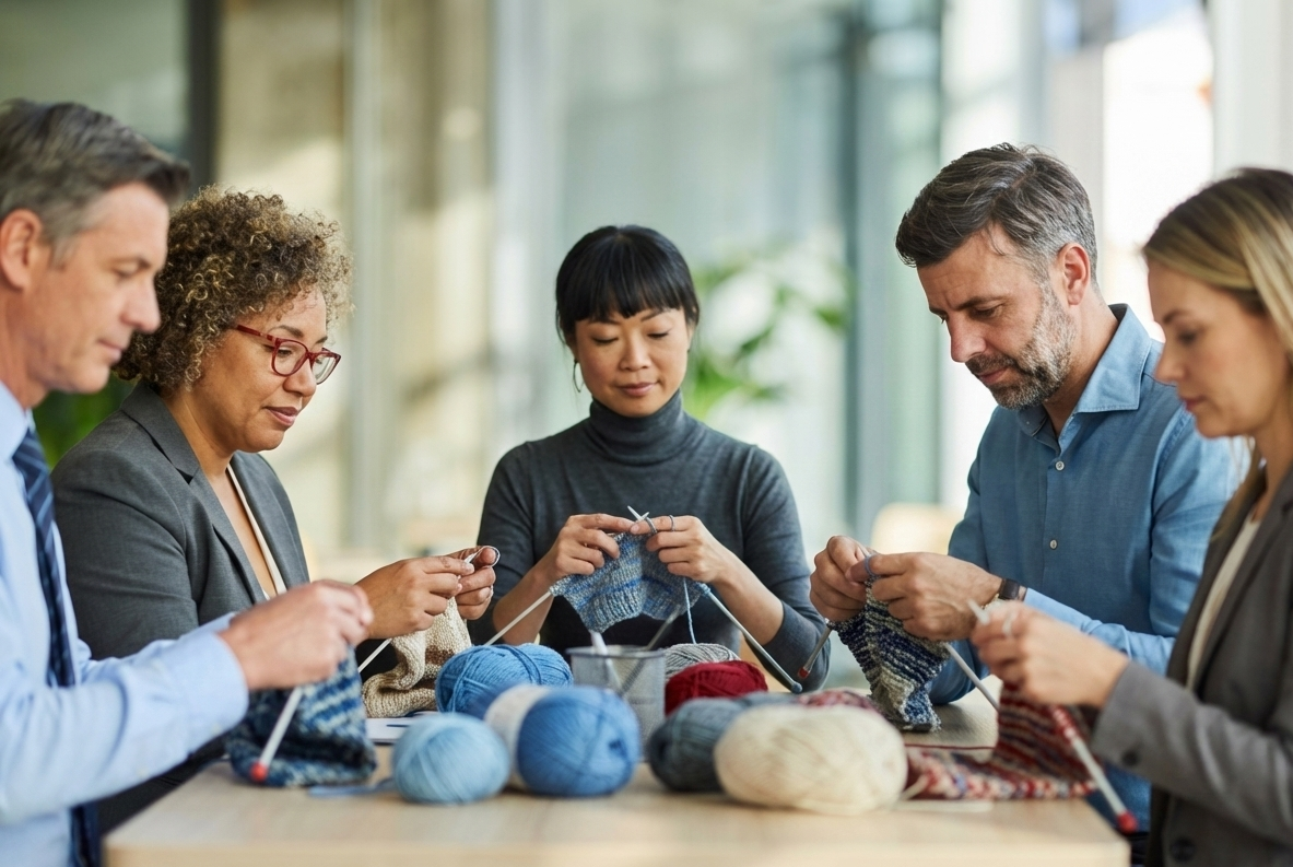 KnittingMind brings mindful, hands-on sessions to workplaces. Each session begins with a short breathing exercise to support stress relief and mindfulness. Completed knitting projects can be donated to charity. First session free